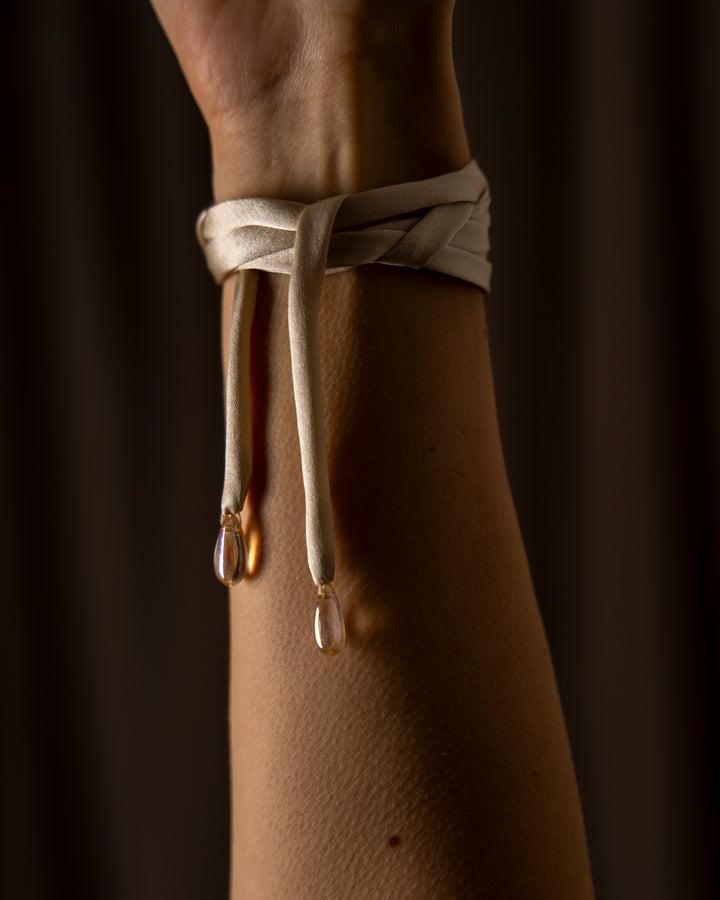 Our silk rouleau cords designed to be worn as you wish, at the neck, on the wrist, or in the hair. Made from remnant 100% silk charmeuse and georgette, finished with hand-selected vintage beads. Limited editions by nature.
